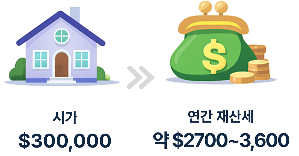 시가 30만 달러 주택을 소유하신다면 연간 재산세는 대략 2,700달러 ~ 3,600달러 정도로 예상하실 수 있습니다.